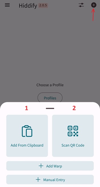 After complete your purchesing, copy your SimurghVPN subscription link, click on + on right top Hiddify app, either click add from clipboard wait until your profil is loadinig to the app, then click blue circle. Or scan your SimurghVPN subscription QRcode by device camera wait until your profil is loadinig on app then click blue circle
